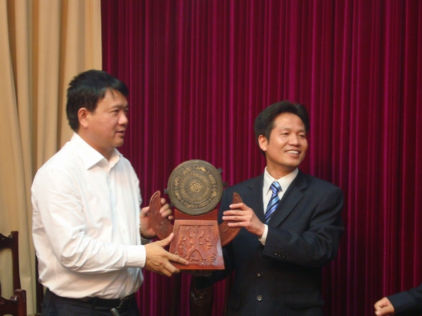 集團(tuán)公司董事長朱堅(jiān)和(上圖右)與越南交通運(yùn)輸部部長丁羅升先生交換禮物。