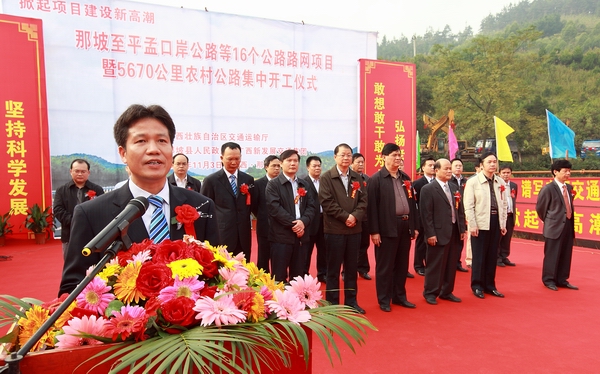 為貫徹落實自治區黨委、政府在全區掀起項目建設新高潮的決策部署,沖刺第四季度,完成全年公路建設目標任務,自治區交通運輸廳于11月3日舉行全區公路路網改造項目集中開工儀式。由集團公司承辦的分會場——那坡至平孟口岸公路等16個公路路網項目暨5670公里農村公路集中開工儀式在百色市那坡縣德隆鄉隆重舉行。自治區交通運輸廳紀檢組長、廳黨組成員朱名勝,百色市市委常委、政法委書記周武紅,市人大常委會黨組成員黃五同,集團公司黨委書記、董事長朱堅和、總經理李定倫、黨委副書記張友坐、副總經理劉明洪、總工程師覃炳賢,自治區公路管理局、百色市公路管理局、交通運輸局、那坡縣四家班子、集團公司直屬各單位領導及有關部門負責人等出席開工儀式。