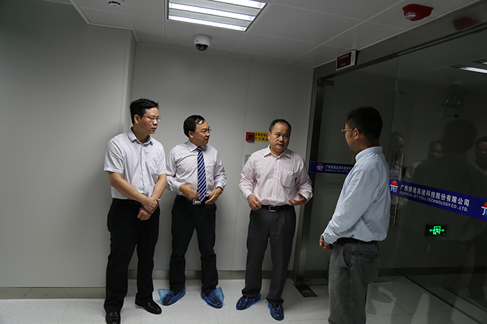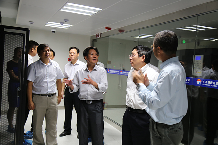 簽約儀式結(jié)束后,與會的各位領(lǐng)導(dǎo)共同參觀了我集團(tuán)公司控股企業(yè)——廣西捷通公司ETC中心機(jī)房,并聽取了技術(shù)人員對中心系統(tǒng)建設(shè)情況、設(shè)備安裝使用情況、機(jī)房運(yùn)轉(zhuǎn)流程、技術(shù)支持、監(jiān)控及操作、消防通道等情況的匯報。