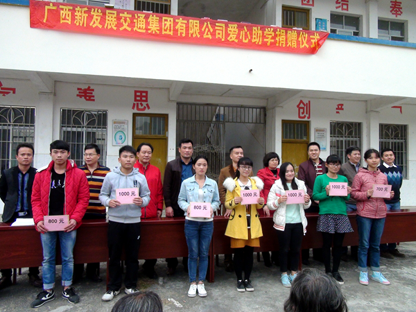 當(dāng)日,集團(tuán)公司在豹山村舉行愛心助學(xué)捐贈(zèng)儀式,掛牌成立了廣西新發(fā)展交通集團(tuán)愛心助學(xué)基金會(huì),向扶貧聯(lián)系點(diǎn)200多名貧困學(xué)子捐資助學(xué)獻(xiàn)愛心。劉明洪副總經(jīng)理殷切希望貧困學(xué)子們努力學(xué)習(xí),常懷感恩之心,學(xué)好本領(lǐng),將來回報(bào)家鄉(xiāng)、回報(bào)社會(huì)。