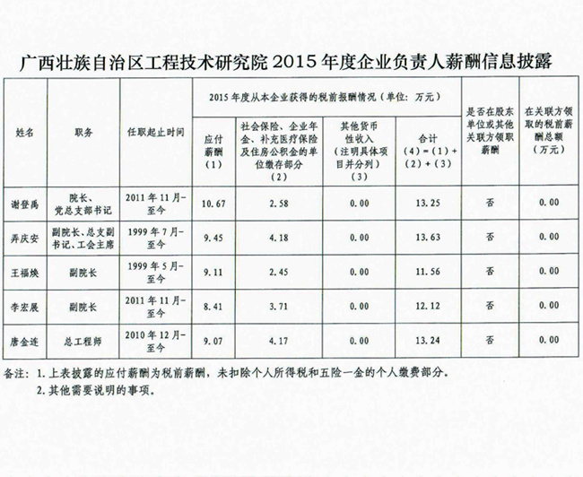 廣西壯族自治區工程技術研究院2015年度企業負責人薪酬信息披露