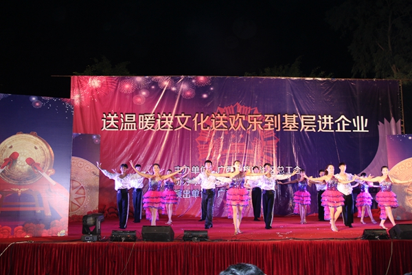 晚上,自治區總工會安排了豐富多彩的慰問演出。整場演出以“勞動托起中國夢”為主題,載歌載舞,奏響勞動光榮的時代主旋律。慰問演出在富有壯族文化風情的《廣西尼的呀》的舞蹈中拉開了序幕,既有《力與美》的高難度雜技表演,又有詼諧幽默、勵志感人的小品《為愛加油》,配樂詩朗誦《心儀廣西》展示了廣西壯鄉的山好水好前景闊,更有優美的舞蹈《魅影》、《工匠精神》等節目更是歌頌了勞動之美。路橋集團員工還帶來配樂詩朗誦《萬里征程品為本,行穩致遠前景闊》和小品《工地愛情故事》,展現了路橋職工的風采。慰問演出在歌舞《不忘初心》中畫上了圓滿的句號,路橋建設者們在這場文化盛宴中度過一個難忘的夜晚。