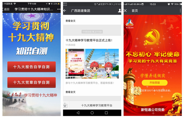 而廣西路建集團、新恒通公司等直屬企業微信公眾號也開辟了十九大精神學習教育平臺,開創性地把知識性較強的黨建知識競答與趣味性十足的搶紅包結合到一起,寓教于樂,大大激發了廣大黨員干部和企業員工的學習積極性。