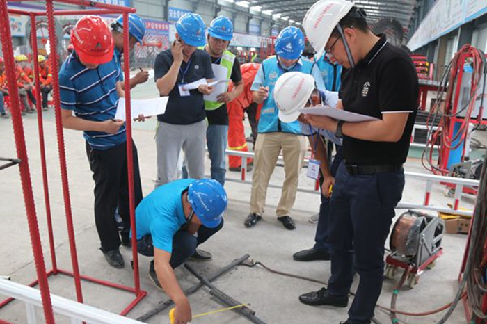 本次比賽采用Ф28鋼筋作為焊接母材,共分為單面平焊、立焊、仰焊三個比賽項目,每位參賽選手需在規定時間內按照比賽要求焊接一組試件。評委按照鋼筋焊縫長度、焊縫深度、焊縫寬度、焊接時間、是否有咬邊、焊接平整度、焊接成型等幾個方面進行評分。