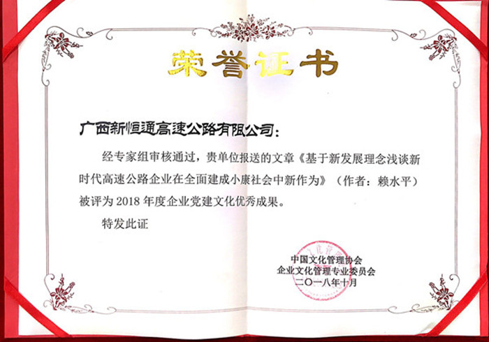 會(huì)上,由賴水平撰寫的文章《基于新發(fā)展理念淺談新時(shí)代高速公路企業(yè)在全面建成小康社會(huì)中新作為》在企業(yè)黨建文化優(yōu)秀成果評比中,被評為2018年度企業(yè)黨建文化優(yōu)秀成果;由新恒通公司都巴指揮部創(chuàng)作團(tuán)隊(duì)拍攝的《遷動(dòng)人心》微電影榮獲“最美企業(yè)之聲”代言作品榮譽(yù)稱號。