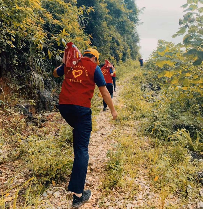 圖5:志愿者扛著慰問品步行到貧困學子家里